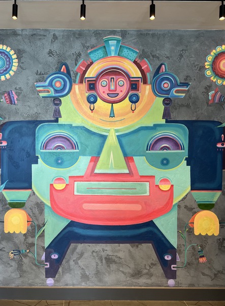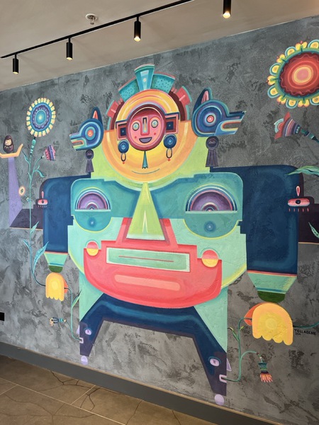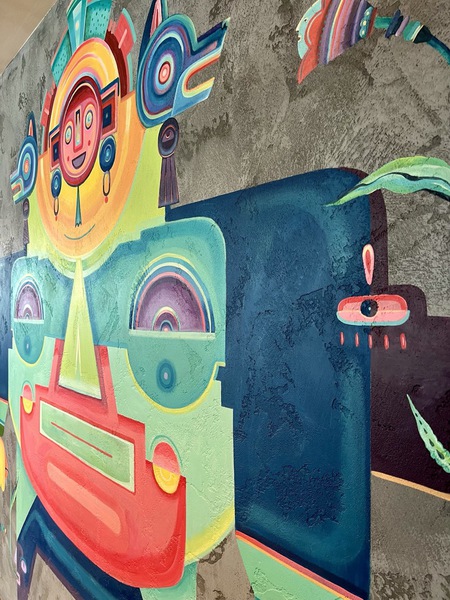 We were invited to install our Distressed Concrete polished plaster, with an added colour wash, to wall areas totalling approximately 270m2 throughout the 9th floor restaurant, and our plaster was also the backdrop for the wall mural pictured below.