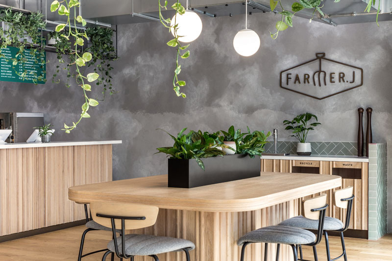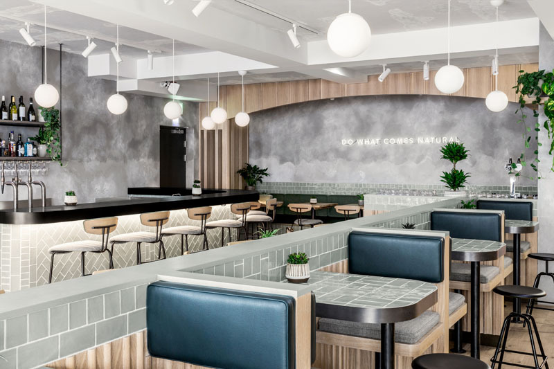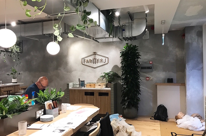 Marmo Stucco were contracted to apply 110m2 of a rather unique concrete polished plaster effect to the wall areas for Farmer J's second addition, just north of London Bridge, near Monument. We used a combination of our Lightly Honed Concrete finish and our Heavily Distressed Concrete finish, in contrasting grey shades with an uneven joint line. A white wash was then applied to dull down the finish and soften the effect.