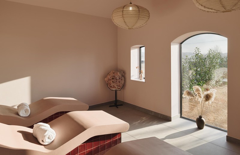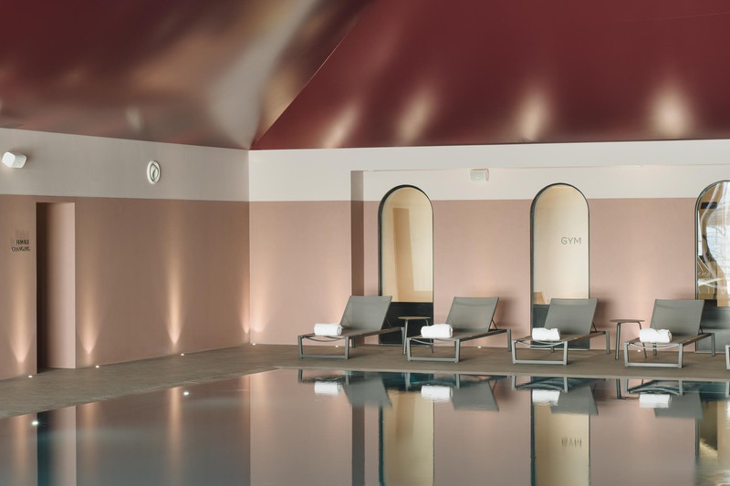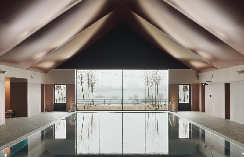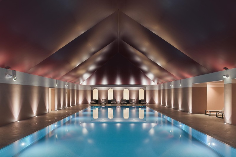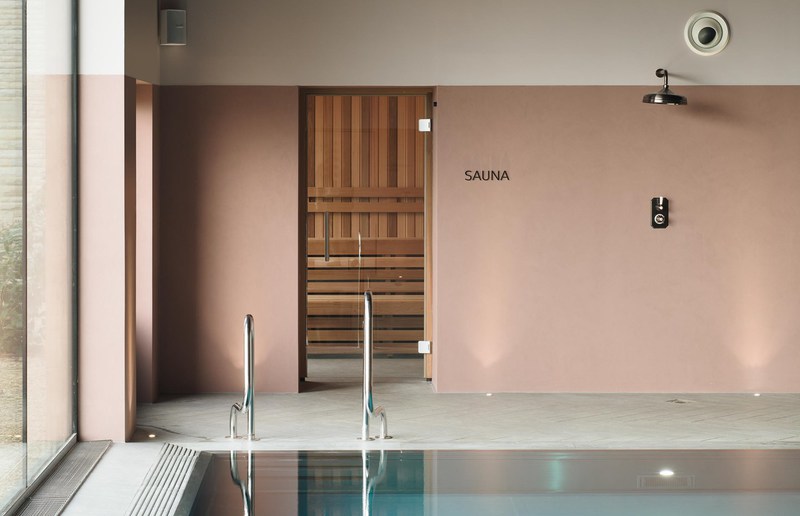For this project, we installed approximately 250m2 of coarse Microcement in the colour "Chestnut" to the pool room walls, and the relaxation beds in the relaxation room. The gentle surface texture of this finish is accentuated with discreet uplighting situated around the pool.